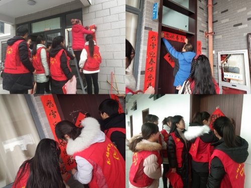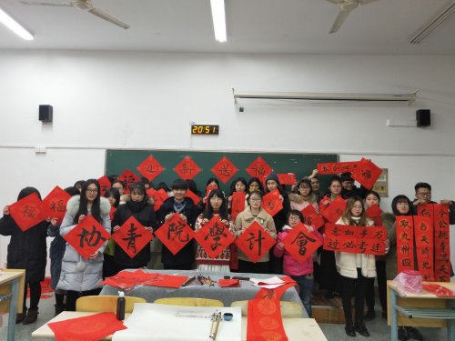 “新年纳余庆,嘉节号长春”,迎新年贴春联,是我国流传至今的民间习俗,是对新一年的祝福和期许。2019年1月1日,会计学院青协携会计学院书法社共同举办了元旦“迎新送福”活动,为全院师生送上新春祝福。 对联是中国传统的文化瑰宝,书法是中国特有的一种文字美的艺术表现形式,作为新时代的新青年,应该将中华民族的瑰宝继承和传扬下去。在2019年来临之际,会计学院青协带领着传统文化爱好者学习对联文化、亲手书写临摹对联、福字。形体方正的楷书气势恢宏,蚕头雁尾的隶书细劲雄健,笔法跳越的魏碑魄力雄强,同学们用自己的作品展示了书法的魅力和书法的独特风格, 2日,青协志愿者们带着大家的祝福,为全校师生送上了同学们亲笔书写的对联和福字,老师办公室门口、食堂门口和宿舍门口都贴上了喜气洋洋的春联和福字,空气中弥漫着浓郁的年味。活动结束后,张文哲同学表示:“我们通过这场活动感受到了中国传统文化的魅力,更体会到了为老师同学送祝福的欣喜。” 同学们浓情满满的祝福在凌冽的寒冬给全校师生带去了浓浓的暖意,受到老师同学的一致好评。