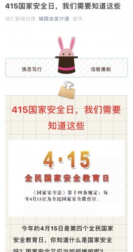 为深入贯彻落实总体国家安全观,进一步提升师生的国家安全意识。2019年4月15日,无锡城市职业技术学院会计学院开展了丰富多彩的以国家安全教育,人人有责,喜迎中华人民共和国成立70周年”为主题的系列宣传教育活动。 策划举办主题展览、师生安全知识竞赛等内容丰富、贴近师生的主题活动;安排团组织、学生社团等组织开展线下宣传活动、主题班会活动和集体学习活动;充分利用微信公众号、电子屏、宣传栏等宣传阵地,组织宣传材料,加大推送力度,形成线上线下宣传合力,切实增强广大师生的国家安全意识,进一步在校园中形成维护国家安全的强大合力。 此次系列教育活动,进一步提升了师生的国家安全意识,形成了人人维护国家安全的良好局面,增强了师生维护国家安全的责任感与使命感,使每个人都自觉成为校园安全、国家安全的捍卫者与守护者。