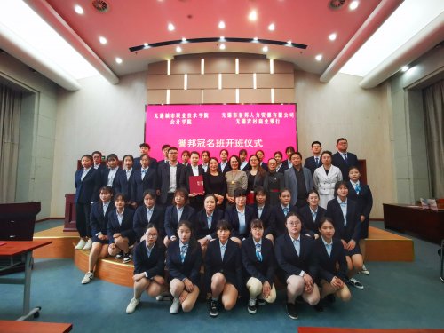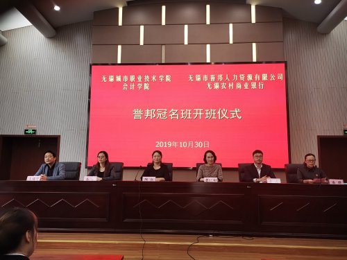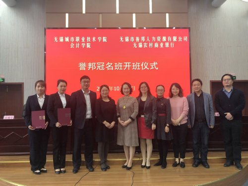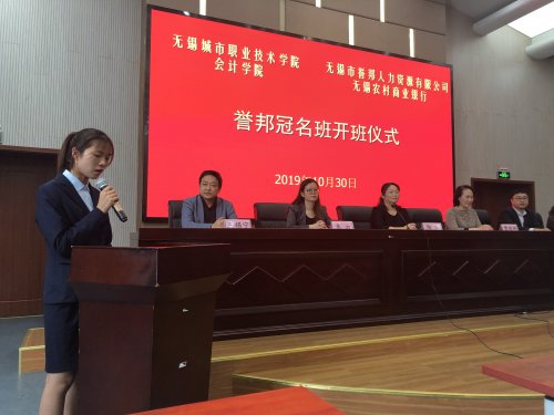 10月30日下午,会计学院2018级银行大堂经理誉邦冠名班开班仪式在北校区小报告厅举行。党委学生工作部(招生就业处)副处长朱云、会计学院副院长陶红、科技处王锡宁主任、无锡市誉邦人力资源有限公司总经理曹晓彬、无锡农村商业银行人事部经理黄波出席,仪式由会计学院党总支副书记潘群主持,会计学院相关负责老师、班主任及冠名班全体学生参加。 开班仪式上,首先由陶副院长介绍了誉邦冠名班的成立背景以及校企共育方案,并对冠名班学生提出了具体要求,希望冠名班学生能珍惜机会,注重实践、勤学苦练。随后,无锡农商行黄经理发言,对我院实习生的表现给予了高度的评价,并详细介绍了无锡农商行的发展规模及银行大堂经理岗位要求;企业代表曹晓彬女士则表达了开展校企深度合作和办好冠名班的决心与信心,表示要实现校企“无缝对接”,实现三方“互利互惠”,让校企合作的双赢之路更加宽敞;优秀实习生尤心怡和大家分享了在农商行的实习经历和心得,鼓励学弟学妹们要积极参加实践,从实践中重新审视自己,不断完善自我;学员代表黄青青表示感谢学校和企业搭建了学习和就业的良好平台,一定会抓住机遇,努力提高专业技能和综合素养,以实际行动来回报学校、回报企业。最后,朱云副处长和王锡宁主任向企业骨干唐宁、华雯琴颁发了企业导师聘书。 此次校企合作冠名班的成立是会计学院稳步推进业财融合教学改革试点工作,逐步完善我院产教融合,校企共育体系的实质性推进,对进一步拓宽学生的就业渠道,提升就业质量有重要的意义。
