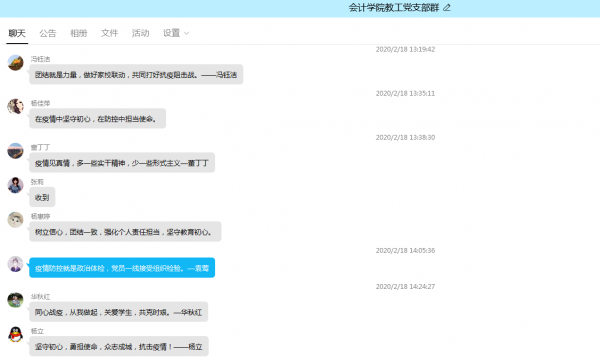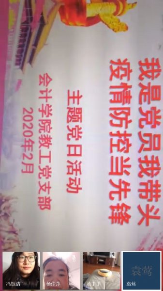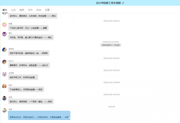 因受新型冠状病毒肺炎疫情影响,在特殊时期为确保工作不断线的同时,将防疫抗疫的主题融入支部活动中,充分发挥党员在防疫抗疫工作中的先锋模范作用。会计学院党支部于2月21日利用“学习强国”网络平台组织开展“我是党员我带头”的线上主题党日活动,此次党日活动以新冠病毒肺炎防疫抗疫期间注重舆论宣传,强化正向引导为主题开展。 教工党支部书记袁莺、学生党支部书记潘佳妮带领全体党员学习了新型冠状病毒肺炎防控的相关知识。根据无锡市市委组织部《关于在新型冠状病毒感染的肺炎疫情防控工作中积极发挥基层党组织战斗堡垒作用和党员先锋模范作用的通知》要求,两位支部书记对全体党员提出了要求并对下阶段党支部的工作进行了布置安排。全体党员踊跃发言,结合发生疫情以来各自的所思所想,对日夜奋战在疫情一线,坚忍不拔、不怕牺牲的白衣天使说出内心想说的话。会计系主任华秋红表示:“虽不在前线,但也要积极响应号召,勇当先锋,在教育教学岗位中都冲在第一线。”辅导员唐晓明老师表示:“向奋战在疫情防控一线的勇士致敬,带头收好规矩,守护好小家,联系好大家。”学生党员陈冬芹表示:“作为一名学生党员,虽然不能在抗疫一线奋战,但在疫情期间,我充分发挥自身优势,发动身边的同学一起制作宣传短片,为在抗疫一线的勇士们加油。” 最后,会计学院党总支副书记潘群表示:各位党员要认真学习并落实党中央、省市委和学校党委对疫情防控的各项部署要求,提高自身政治站位和责任意识,始终把学生健康安全放在首位。树立大局意识,听党指挥,积极发挥党员先进模范作用,不造谣、不传谣、不信谣,及时了解学生的思想动态,正确引导师生疫情防控。希望广大党员不忘初心、牢记使命、弘扬正气、积极宣传、科学防范。