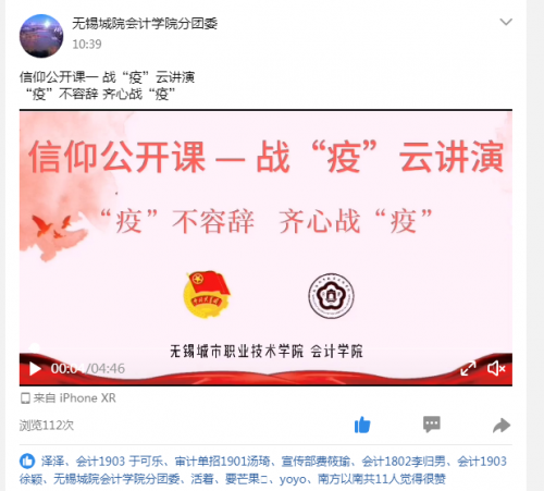为全面做好新冠肺炎疫情防控特殊时期的共青团工作,落实校团委有关工作要求,会计学院分团委在延期开学期间组织开展以“青春战‘疫’,青年同行”为主题的系列活动。 青春战“疫”,爱国同行 会计学院分团委将团员青年思想引领与疫情防控工作相结合,面向全体青年学生开展“信仰公开课——战‘疫’云讲演”活动,各班级团支部广泛搜集素材、凝练观点、制作视频,通过qq、抖音等平台,将内涵深刻、鲜活生动的云讲演与班级团员共分享,实现了全院全员全覆盖。经过各团支部推选,会计学院将遴选出的战“疫”云讲演优秀视频,依托“城院会言计语”微信公众号、会计学院分团委qq进行展播,进一步强化学习效果。 青春战“疫”,法治同行 会计学院分团委开展“青春战“疫”,法治同行”线上主题团日活动,同时制作了防控疫情法治宣传小短片,加强广大团员青年学法、懂法、知法、守法意识,教育广大团员青年严格遵守防控举措,引导青年学生不信谣、不传谣更不造谣,有效利用假期时间提升自我素质,在有序参与中展示爱心、专业与担当。 青春战“疫”,志愿同行 岂曰无衣,与子同袍。战“疫”时刻,会计学子也绝不“缺位”。会计学院通过线上开展防疫政策与知识宣讲、学业帮扶、心理援助等志愿服务为居家防疫的青年学生穿好“心理防护服”,线下共有9名志愿者参与了基层一线防控工作,在奉献中锤炼自我。同时引导学生以团队或个人形式,依托网络开展实践活动,并围绕志愿服务体系、基层社会治理、社会动员机制等视角撰写调研报告,挖掘身边抗“疫”先进人物的事迹和精神,创造抗击疫情的文化作品。 乌云遮不住太阳,阴霾终究将散开。在疫情面前,会计学院学子一定坚定信心,积极行动,以青年之自信、青年之担当、青年之作为,主动践行新时代的青春使命,勇做志愿者、奉献者、守护者、战斗者!