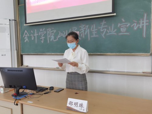 华秋红和邵明珠从系部专业基本情况、专业能力证书选择、专业教学情况以及专业学习要求四个方面对大数据与会计专业的学生进行了专业介绍,除了鼓励学生在本校学习时要积极努力之外,更详细为大家介绍了专转本的情况,激励学生成为“想做事、会做事、做成事、好共事、不出事”的可信又可用的德才兼备之人。