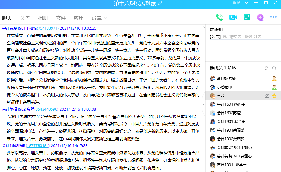 学生支部党员钱文娟老师表示,中共十九届六中全会的召开,是对党的百年奋斗重大成就和历史经验的圆满总结,让我们认识了过去是对当前面临的世界百年未有之大变局和疫情全球大流行交织影响,以及外部环境更趋复杂严峻形势下的客观总结;让我们认清现在,并对今后可能遇到的发展和安全问题的未雨绸缪;让我们知道如何规划未来。在新时期,每个党员教师都应该充分认识发挥先锋模范作用的重要意义,惟有以强烈的责任感、使命感,保持共产党员的先进本色,坚持人民教师诲人不倦的育人精神,才能真正当好一名党员教师,成为党员中的优秀者,教师中的佼佼者,才能自觉地把党和国家、人民群众对教育的要求自觉落实到行动上。