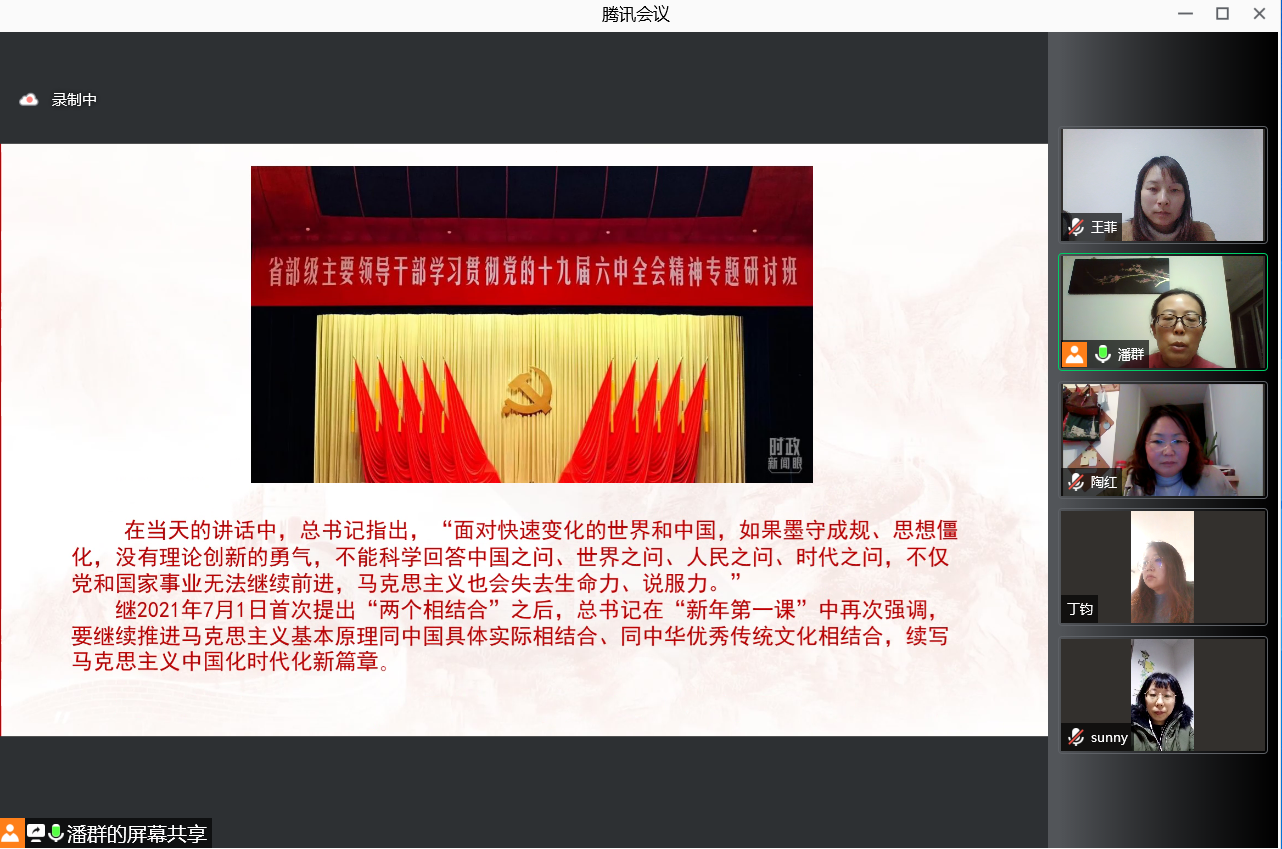 1月21日晚,会计学院党总支理论学习中心组通过视频在线形式,举行2022年第一次集中学习,专题学习习近平总书记在《省部级主要领导干部学习贯彻党的十九届六中全会精神专题研讨班开班式》上的重要讲话。会计学院党总支书记潘群主持并作专题领学,陶红、袁莺、丁钧、王菲参加会议。 会上,潘群领学主题为《历史启迪未来——学习习近平总书记在<省部级主要领导干部学习贯彻党的十九届六中全会精神专题研讨班开班式>上的讲话》。她指出,1月11日,习近平总书记在省部级主要领导干部专题研讨班开班式上主讲的“新年第一课”,开宗明义,意蕴深长,其引导我们要深入研读和领会党的十九届六中全会决议,继续把党史总结、学习、教育、宣传引向深入,更好把握和运用党的百年奋斗历史经验,弘扬伟大建党精神,增加历史自信、增进团结统一、增强斗争精神,动员全党全国各族人民坚定信心、勇毅前行,为实现第二个百年奋斗目标而不懈努力。同时,她围绕五个问题作了详细概述,即理论创新——用马克思主义之“矢”去射新时代中国之“的”,怎么看怎么办——正确把握社会主要矛盾和中心任务,战略策略——要善于从战略上看问题、想问题,勇于自我革命——决不能滋生已经严到位的厌倦情绪,党史学习教育——建立常态化长效化制度机制。她强调,要继续巩固拓展党史学习教育成果,推动全面从严治党向纵深发展;要切实把思想和行动统一到习近平总书记重要讲话精神上来,更好落实以史为鉴、开创未来的重要要求;要满怀信心奋进新征程、建功新时代。随后,她结合会计学院实际,着重强调了要在深刻领会习近平总书记关于上述五个问题的重要论述中,认清会计学院高质量发展进程中,战略定位、制度规范、队伍建设等方面的目标任务,要“知所从来,识其所在,明其将往”,以优异成绩迎接党的二十大胜利召开。 随后,丁钧、王菲作学习发言。 丁钧说道,习近平总书记在省部级专题研讨班上的重要讲话,政治蕴意、理论价值、实践要求十分丰富,更坚定了其在工作中,一是要自觉坚持理论创新,以理论创新引领实践创新;二是要自觉抓住主要矛盾,正确把握主要矛盾和中心任务,以重点突破带动全局工作;三是要自觉推进自我革命,坚决防止精神懈怠、精神被动、精神懒惰。 王菲说道,过去的一年,在学院党总支的带领下,学院每一名党员都积极投身到百年党史的学习中;学习是真的,实践是真的,收获也是真的。对于新一年的工作,要继续传承好红色基因,保持好“我为群众办实事”的服务初心,将学习成效转化为立德树人、奋勇担当的社会实践,在真抓实干中长才干、向未来。 |