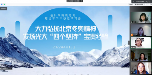 北京冬奥会、冬残奥会的筹办举办,推动了我国冰雪运动跨越式发展,开启了中国乃至全球冰雪运动新时代。为更好学习贯彻习近平总书记在北京冬奥会冬残奥会总结表彰大会上的重要讲话精神,4月13日,会计学院党总支在腾讯会议室召开4月份理论学习中心组学习交流会,共话主题《大力弘扬北京冬奥精神发扬光大“四个坚持”宝贵经验》并作学习交流。 党总支书记潘群交流分享道,办好中国的事情,关键在党。在全党全国各族人民喜迎党的二十大、信心百倍向第二个百年奋斗目标迈进的关键时刻,北京冬奥会、冬残奥会的成功凝聚起全国共筑中国梦、一起向未来的磅礴力量。回顾习近平总书记对北京冬奥精神丰富内涵的精辟概括,即胸怀大局、自信开放、迎难而上、追求卓越、共创未来,对于全中国人民来说,这是一种信念,更是一种号召,要始终不渝坚持党的领导,深刻领会“两个确立”的决定性意义,增强“四个意识”、坚定“四个自信”、做到“两个维护”,团结一心战胜前进道路上的任何艰难险阻,办成我们想办的任何事情。 党总支委员陶红分享道,北京冬奥会、冬残奥会,从申办成功到胜利举办,历经7年艰辛努力。习近平总书记在总结表彰大会上,全面回顾了总结了办赛的宝贵经验,深刻阐述了北京冬奥精神,对运用好冬奥遗产推动高质量发展提出明确要求。通过学习习近平总书记的重要讲话精神,砥砺我要发扬北京冬奥精神,以更加坚定的自信、更加坚决的勇气,做好新时代的赶考人,答好新时代的答卷;此外,学院高质量发展同样要紧密携手共创未来,在推动工作的过程中,多想一步、多干一步,协同效应才会愈发明显。 教工支部书记袁莺分享道,人无精神则不立,国无精神则不强;体育的力量影响一代又一代人,体育的竞技场上必有成败之分,这又恰好是体育另一种魅力所在。为此,我们一是要把体育精神的旗帜举过头顶,放在心间,让爱国主义成为深入人心的力量;二是要充分认识和发挥好奥运冠军榜样力量的价值引领,让奥运冠军成为鼓舞青年斗志的旗帜、指引新时代青年前进方向的灯塔;三是要讲好以优秀运动员为核心的项目文化故事,打造和培育具有优秀个人品质和良好运动成绩的体育明星形象,为实现中华民族伟大复兴的中国梦固本培元、凝心铸魂。在教育工作中,也要充分挖掘体育蕴涵的丰富育人功能与价值,为青年成长补钙强身,为民族兴旺强筋壮骨,为振兴中华后继有人做好全面育人的工作。 总支委员、学工支部书记王菲分享道,“中国人历来言必信、行必果。”习近平总书记在北京冬奥会、冬残奥会总结表彰大会上发表重要讲话,郑重宣示“向世界奉献了一届简约、安全、精彩的奥运盛会,全面兑现了对国际社会的庄严承诺”。作为一名党员教师,从这次北京冬奥会、冬残奥会中,我收获了三点主要启示,一是没有随随便便的成功,成功必然凝结着各条线人们的辛勤付出和智慧汗水,因此,要以强烈的责任感、使命感、荣誉感,与大家一起努力完成各项工作任务;二是要在工作中,承载对和平、团结、进步的美好追求,因此,要在共同合作中相互尊重、彼此激励、突破极限,在新时代的赶考路上奋勇前行;三是要始终不渝坚持党的领导,攻坚克难作出新的贡献,因此,要深刻认识“两个确立”的决定性意义,增强“四个意识”、坚定“四个自信”、做到“两个维护”,以更加坚定的自信、更加坚决的勇气向未来。 办公室主任丁钧分享道,在全球疫情背景下,北京冬奥会、冬残奥会能够顺利举办,一切都源于党的强有力领导和人民的团结奋斗。事实再次充分证明,中国共产党是我们成就伟业最可靠的主心骨,只要始终不渝坚持党的领导,就一定能够战胜前进道路上的任何艰难险阻,就一定能够办成我们想办的任何事情。此次盛会的成功,不仅在于赛事的成功,更在于通过筹办举办冬奥会、冬残奥会带动了各方面建设,为经济社会发展带来了深远的积极影响。在今后的工作中,我们要充分运用冬奥会、冬残奥会成功举办给我们带来的宝贵经验,为实现第二个百年奋斗目标做出我们这一代人应有的贡献!