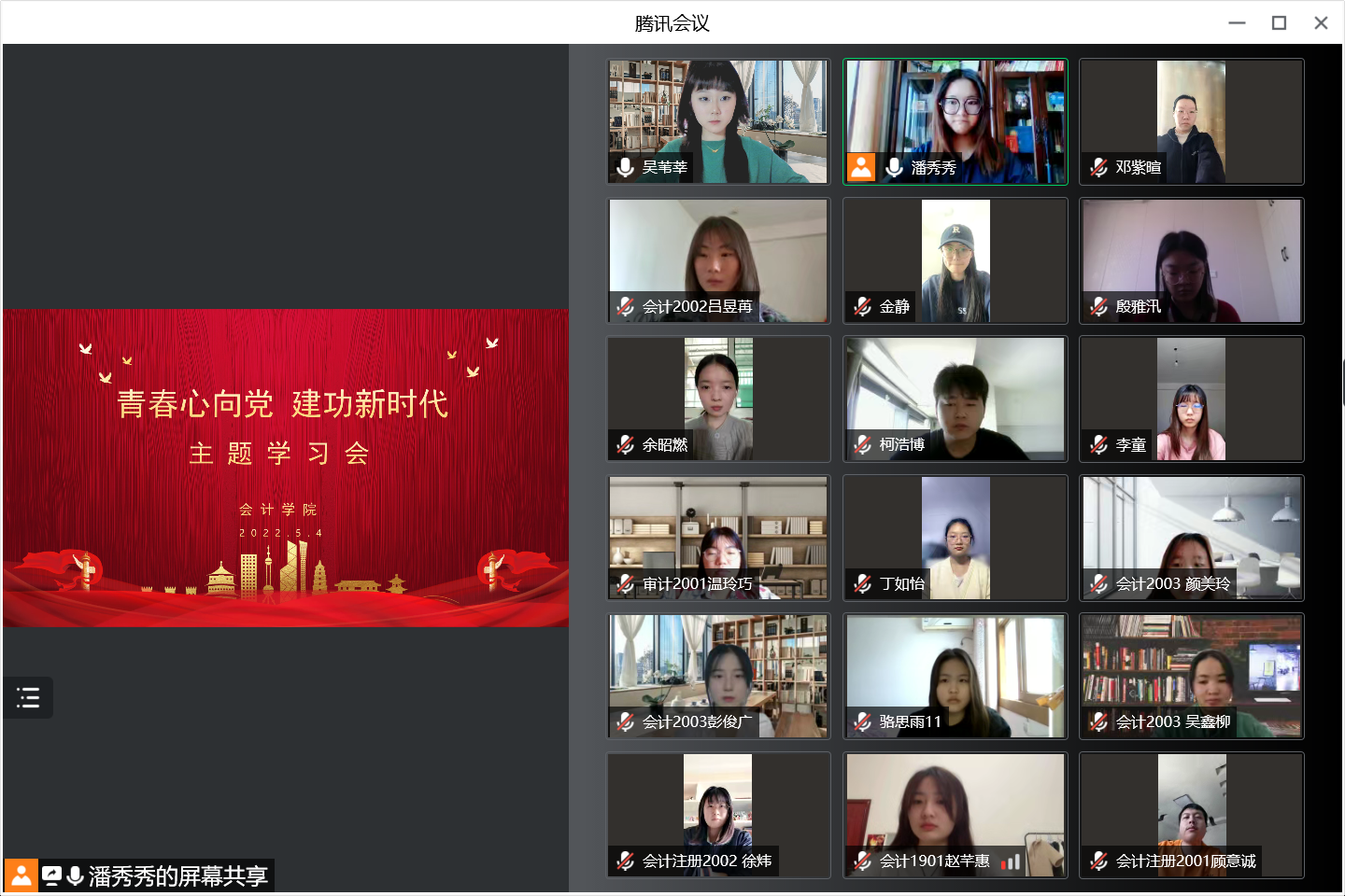 为迎接党的二十大胜利召开,纪念五四运动103周年,激励引导会计学院广大青年继承和发扬五四精神,发挥先进典型引领作用,增强全体青年的凝聚力和向心力,会计学院举办“青春心向党,建功新时代”五四青年节主题学习活动。会计学院学工办主任王菲、学生会负责老师潘秀秀出席活动。 活动开始,会计学院青年师生共同学习了习近平总书记在中国人民大学考察时的重要讲话精神。首先是潘秀秀老师领学,她说,在五四青年节即将到来之际,习近平总书记到中国人民大学考察并发表重要讲话,充分体现了以习近平同志为核心的党中央对教育事业的高度重视,对广大教师和青年学生的亲切关怀、殷切期望。习近平总书记的重要讲话强调,要坚持把马克思主义基本原理同中国具体实际相结合、同中华优秀传统文化相结合,立足中华民族伟大复兴战略全局和世界百年未有之大变局,不断推进马克思主义中国化时代化。培养社会主义建设者和接班人,迫切需要我们教师既精通专业知识、做好“经师”,又涵养德行、成为“人师”,努力做精于“传道授业解惑”的“经师”和“人师”的统一者。立足新时代新征程,中国青年的奋斗目标和前行方向归结到一点,就是坚定不移听党话、跟党走,努力成长为堪当民族复兴重任的时代新人。 接着,预备党员郑学云、金静、丁如怡分别做了学习感悟发言,党员发展对象吴苇莘分享道,“青年更要不懈奋斗和勇敢追梦,用一生来践行理想信念,牢记习近平总书记提出的16字箴言‘勤学、修德、明辨、笃实、爱国、励志、求真、力行’,真正让奋斗成为青春底色。把人生奋斗汇入实现中华民族伟大复兴的时代洪流,踔厉奋发、勇毅前进,在青春的赛道上奋力奔跑,跑出当代青年的最好成绩。”