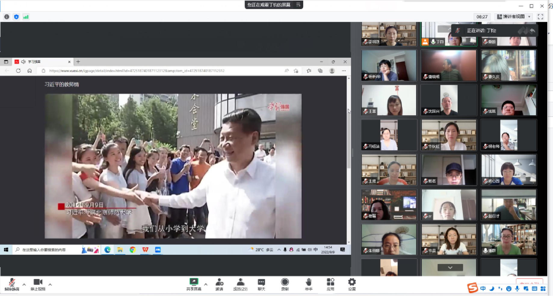 党的十八大以来,习近平总书记始终高度重视教师队伍建设,在不同场合多次强调教育事业的重要意义,对广大教师提出殷切期望。正值第38个教师节来临之际,为进一步加强师德师风建设,激励爱岗敬业情感、增强职业归属感,9月9日下午,会计学院举行“学习贯彻习近平教师节重要寄语”活动。活动由会计学院党总支书记潘群主持,全体教职工通过腾讯会议参加活动。 潘群向全体教职工致以节日的祝福,对在校参加防疫志愿服务的教职工们付出的辛勤劳动表示感谢。她提出要把学习习近平重要讲话指示精神和日常工作结合起来,胸怀“国之大者”,牢记为党育人、为国育才的初心使命;要始终坚守教师本位,筑牢师德师风底线,做学生品格、品行、品味的“大先生”,做学生德智体美劳全面发展的“引路人”;要始终保持热爱教育的定力和淡泊名利的坚守,把握职业发展特色和定位,在新的舞台上踔厉奋发、笃行不怠,为推动学院高质量发展贡献力量。 随后,全体教师共同观看《习近平的教师情》,重温总书记和人民教师在一起的温情瞬间。视频中,总书记向全国广大教师和教育工作者致以节日的祝贺和诚挚的慰问,对广大教师所作的重要贡献给予充分肯定,寄语广大教师不忘立德树人初心,牢记为党育人、为国育才使命,积极探索新时代教育教学方法,不断提升教书育人本领,为培养德智体美劳全面发展的社会主义建设者和接班人作出新的更大贡献。 老师们被习总书记的话深深感动,同时也深刻认识到肩负的责任和使命。今后的日子里,全体教师将会牢记习近平总书记的亲切寄语和关怀,切实增强教师教书育人的责任感、使命感和荣誉感。不断提升自身思想政治素质和师德学养水平,深入学习职业道德规范以及相关政策文件,自觉将师德规范转化为内在信念和行为品质,提高师德践行能力,着力营造风清气正的教育生态。 |
