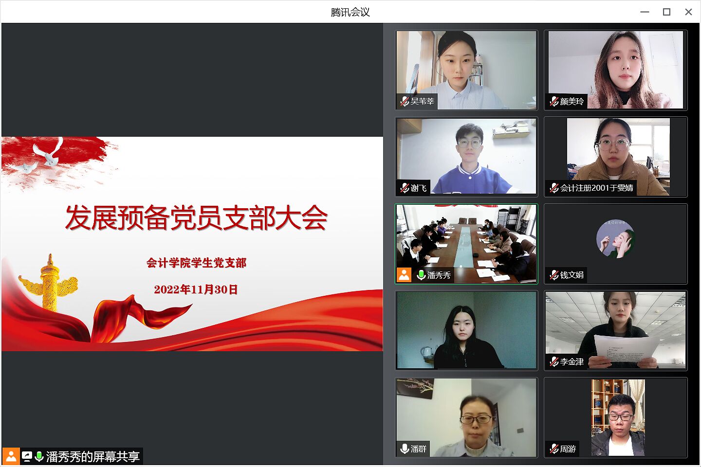 11月30日下午,一场面向刚刚加入党组织的12名新党员的党性修养专题党课,在会计学院会议室召开。会计学院党总支书记潘群,作了题为《如何“做”一名合格共产党员》的专题党课,学生支部全体师生党员聆听党课。考虑疫情原因,部分同志不能到现场,会议采用线上线下结合的形式。
