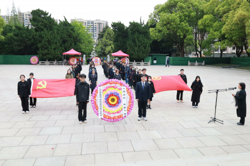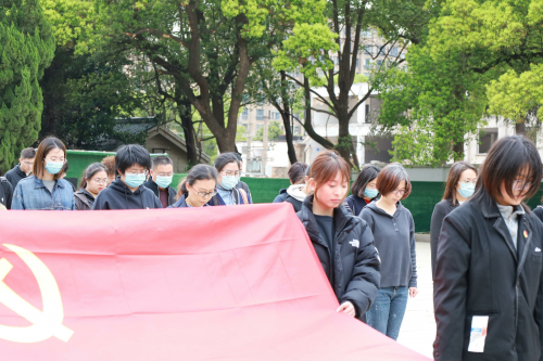 党总支书记潘群在纪念碑下宣读祭文 随后,由会计学院党总支副书记左占卫领誓,全体党员高举右拳,面对鲜红党旗,庄严重温入党誓词,筑牢入党初心。